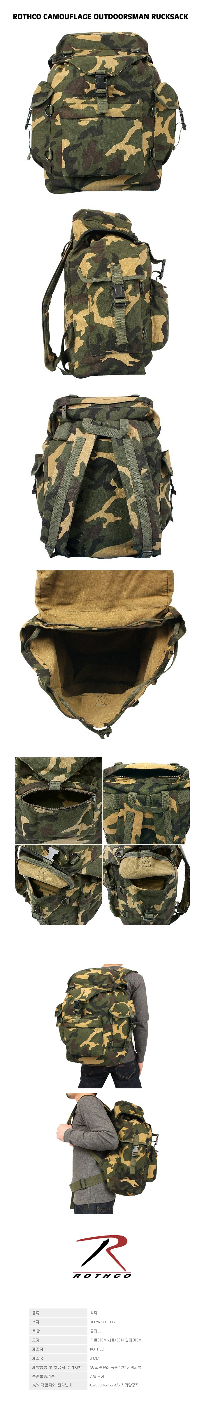 ROTHCO :: 2306 ROTHCO CANVAS OUTDOORSMAN RUCKSACK WOODLAND CAMO 아메리칸 밀리터리 브랜드 ROTHCO의 ROTHCO CANVAS OUTDOORSMAN RUCKSACK WOODLAND CAMO. 자연스러운 빈티지 가공이 된 두께감이 있는 캔바스 재질로 제작된 유럽스타일의 백팩입니다. 충분한 두께감으로 내마찰성이 좋으며, 충분한 크기와 전면의 1개의 포켓과 좌/우, 상단의 포켓으로 수납능력도 좋은 제품입니다. 전체적으로 톤다운된 WOODLAND CAMO 색감에 심플한 디자인으로 어떤 스타일에도 잘 어울리는 제품입니다. 자주 꺼내고 넣을 수 있는 전면 가운데 포켓과 상단포켓은 지퍼처리되어 있으며, 양사이드의 포켓은 밀리터리 디자인의 플랩포켓입니다. 길이조절이 가능한 패딩처리되어 있는 헤비웨이트 캔버스 재질의 어깨끈이 어깨의 피로를 막아줍니다. 디자인 효과와 많은 짐을 넣었을 때 유용한 허리 벨트가 있습니다. 아웃도어나 1박 2일정도의 여행에 충분한 용량의 수납이 가능하며, 통학이나 일상 용도로도 손색이 없는 활용도가 높은 제품입니다. MADE IN INDIA 100% POLYASTER 가로33CM 세로48CM 깊이20CM