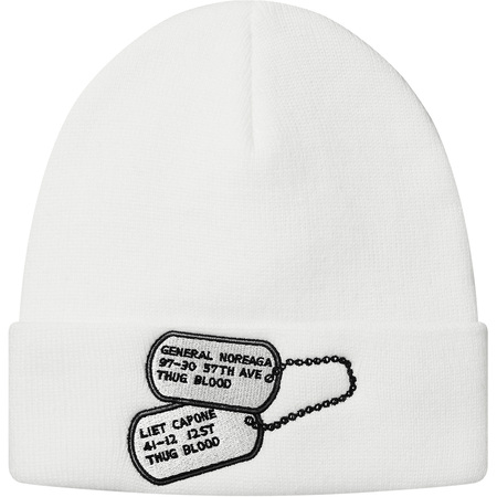 Supreme The War Report Beanie. / Acrylic cuffed beanie with embroideries on front and back of cuff. Original artwork from Capone-N-Noreaga’s The War Report.