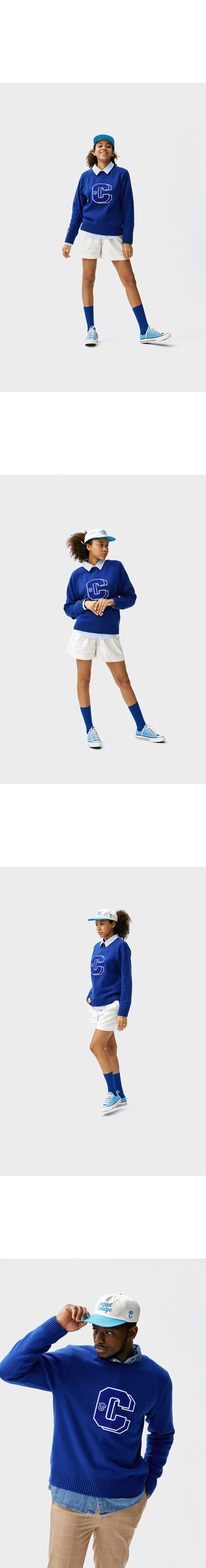 컨셉트 컬리지의 새로운 더블 C패치가 돋보이는 비비드한 블루 컬러의 램스울 니트입니다.