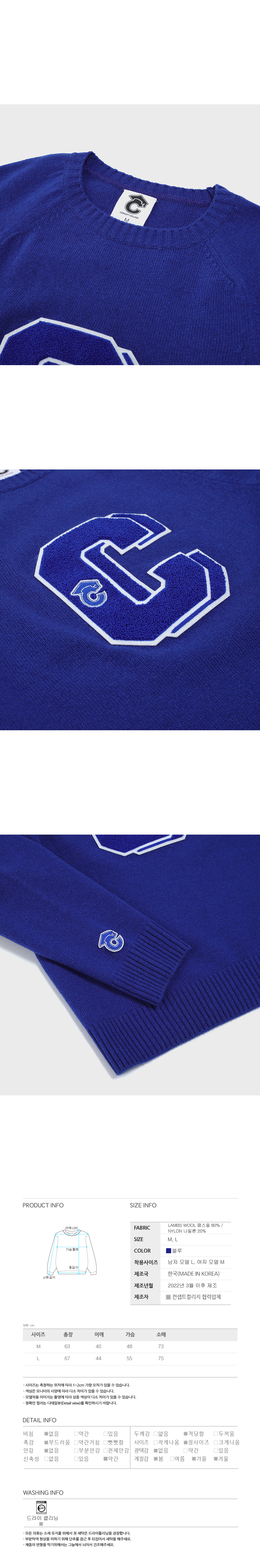 - 램스울 80%의 고급 원사를 사용하여 착용 시 부드러운 핏 감을 느낄수 있습니다.