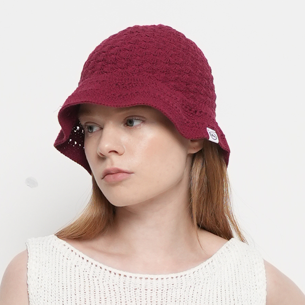 스트링 디테일로 안정감 있게 착용되는 니트 비치 버킷햇