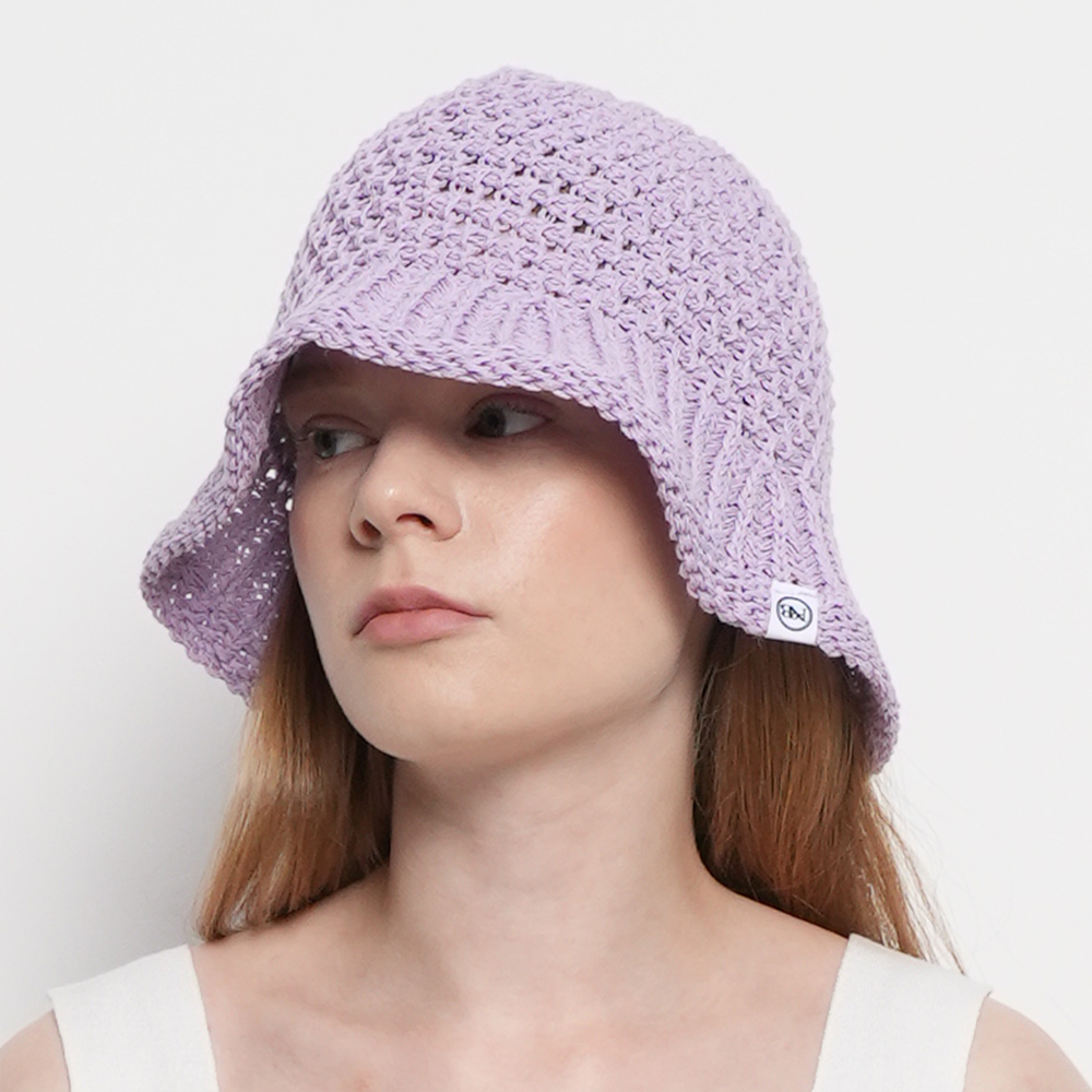 스트링 디테일로 안정감 있게 착용되는 니트 비치 버킷햇