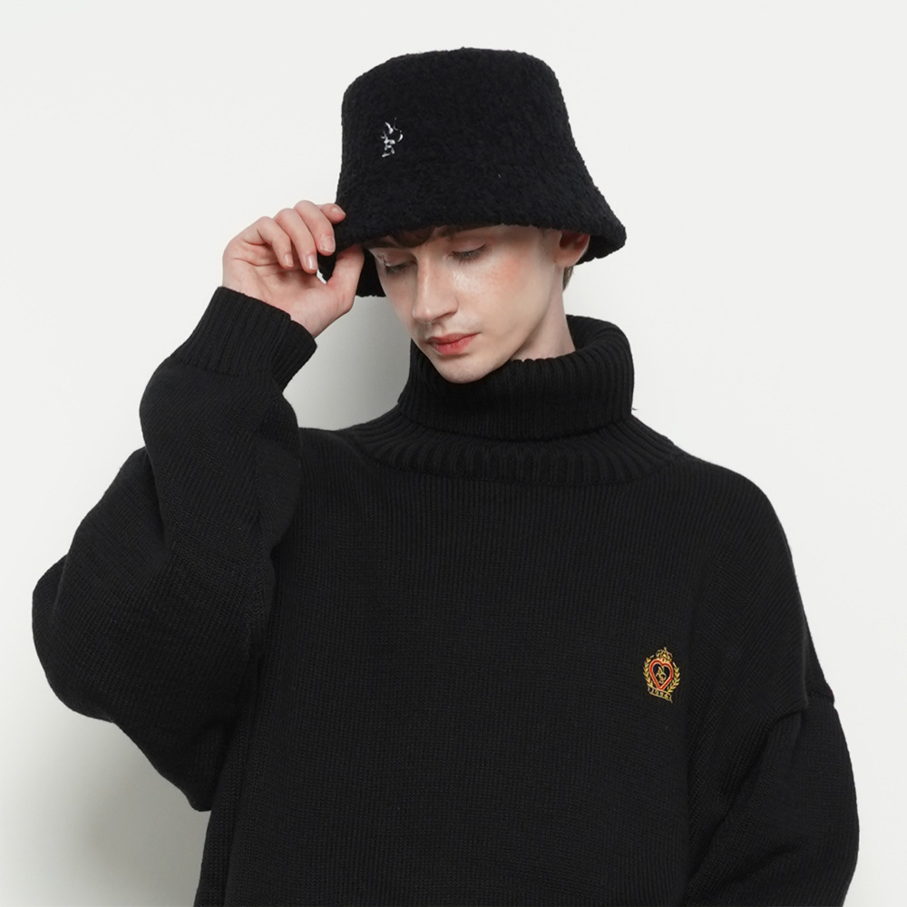 스트링 디테일로 안정감 있게 착용되는 니트 비치 버킷햇