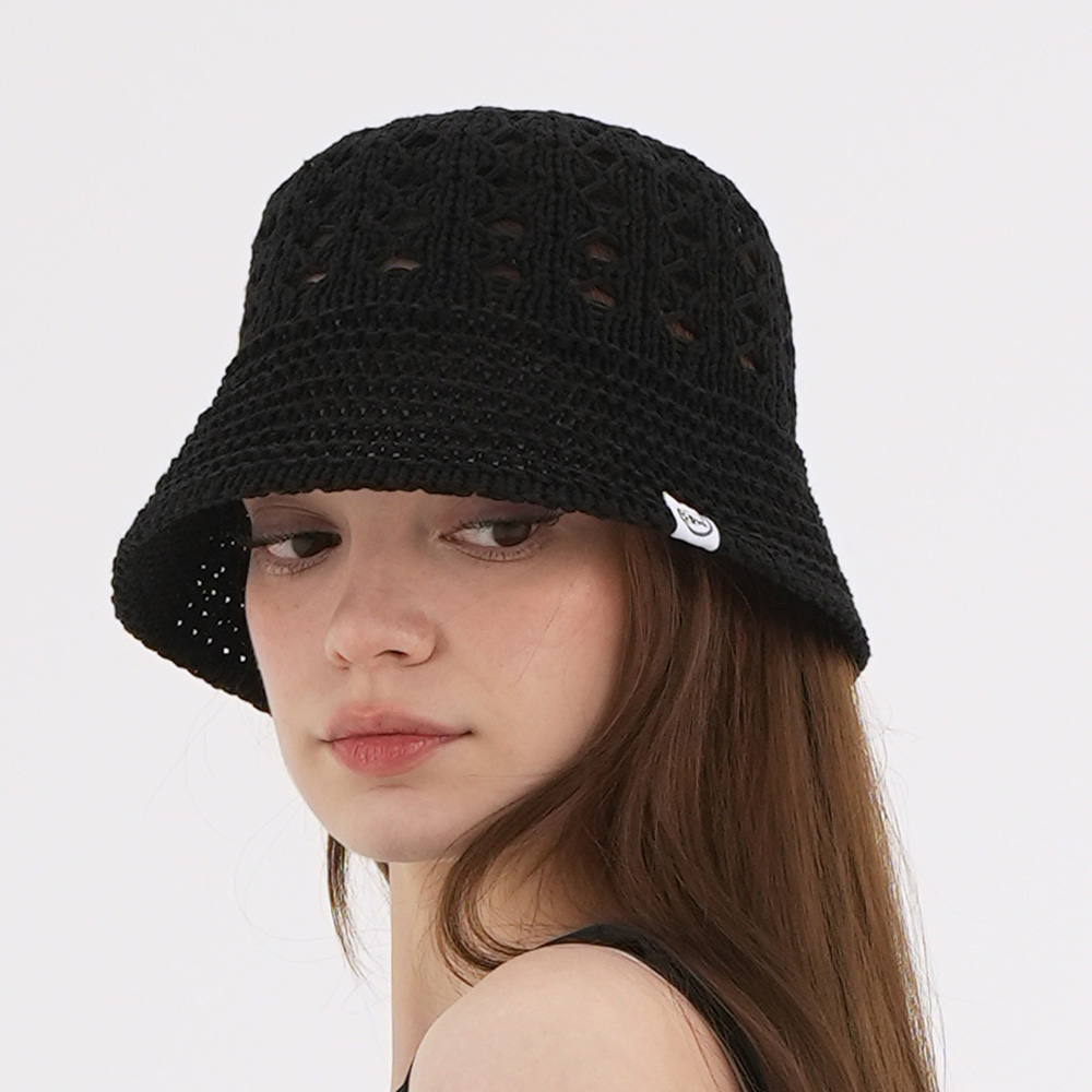 스트링 디테일로 안정감 있게 착용되는 니트 비치 버킷햇