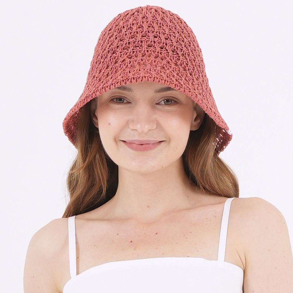 스트링 디테일로 안정감 있게 착용되는 니트 비치 버킷햇