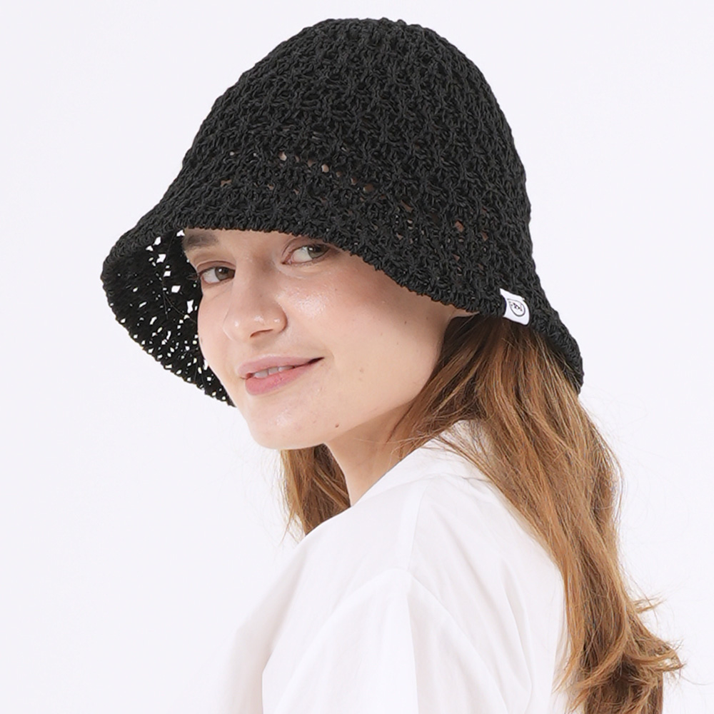 스트링 디테일로 안정감 있게 착용되는 니트 비치 버킷햇
