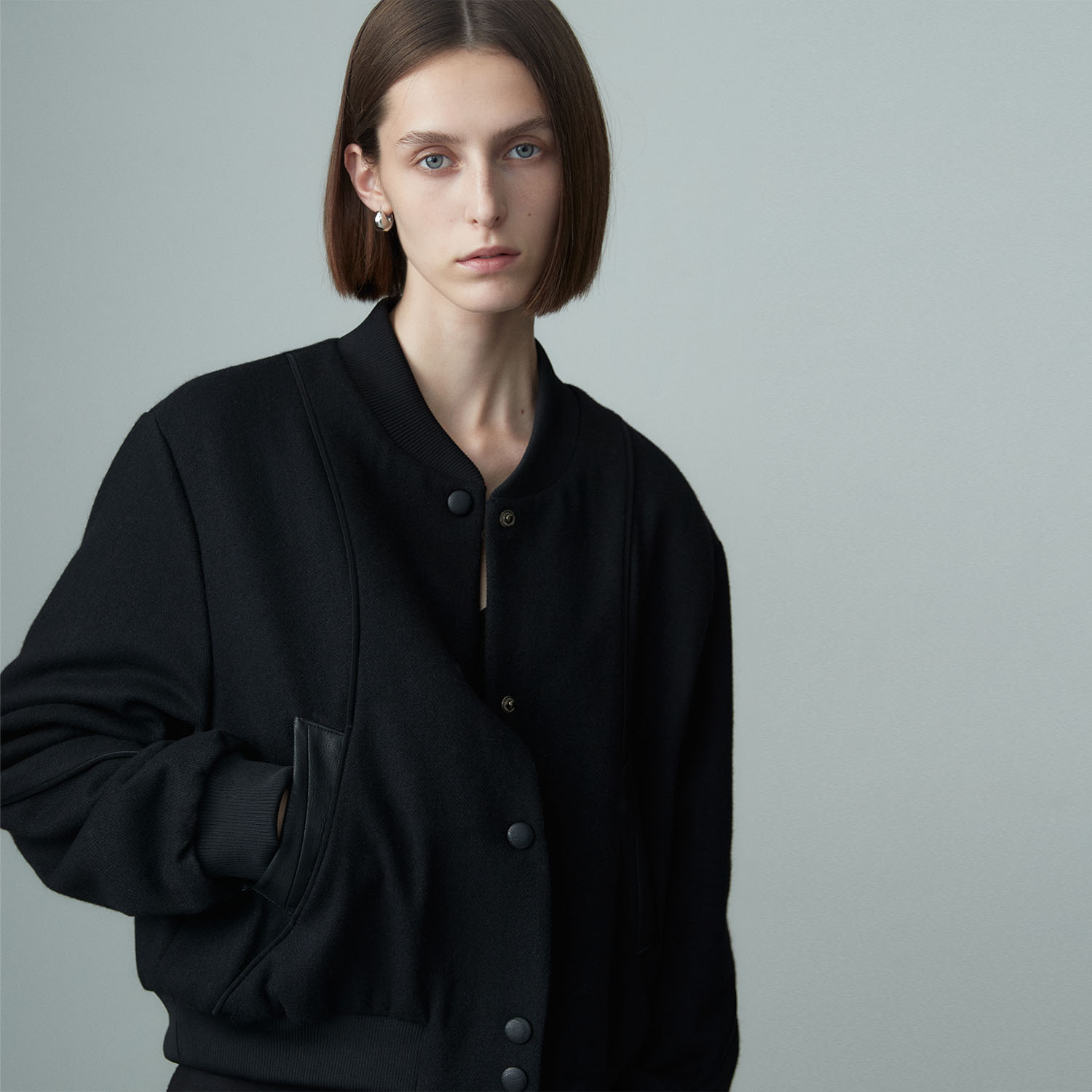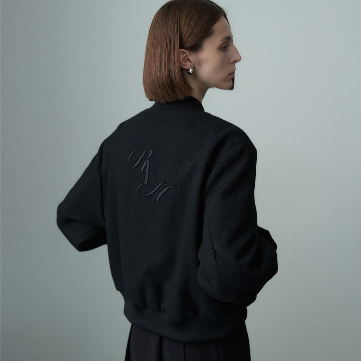 고급스러운 텍스처의 울 혼방 소재와 함께 어우러지는 배색 소재감들이 매력적인 바시티 자켓입니다.