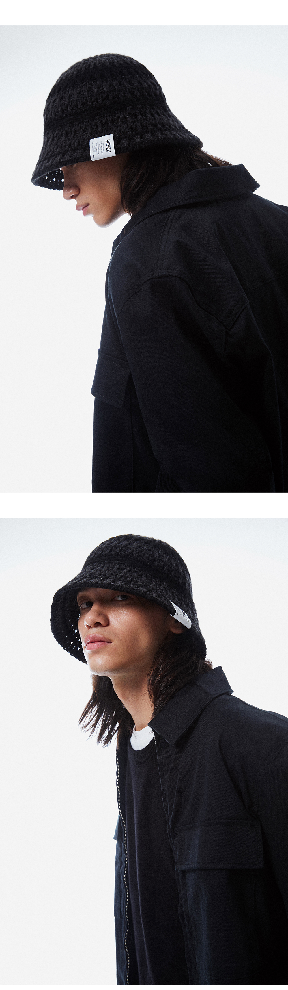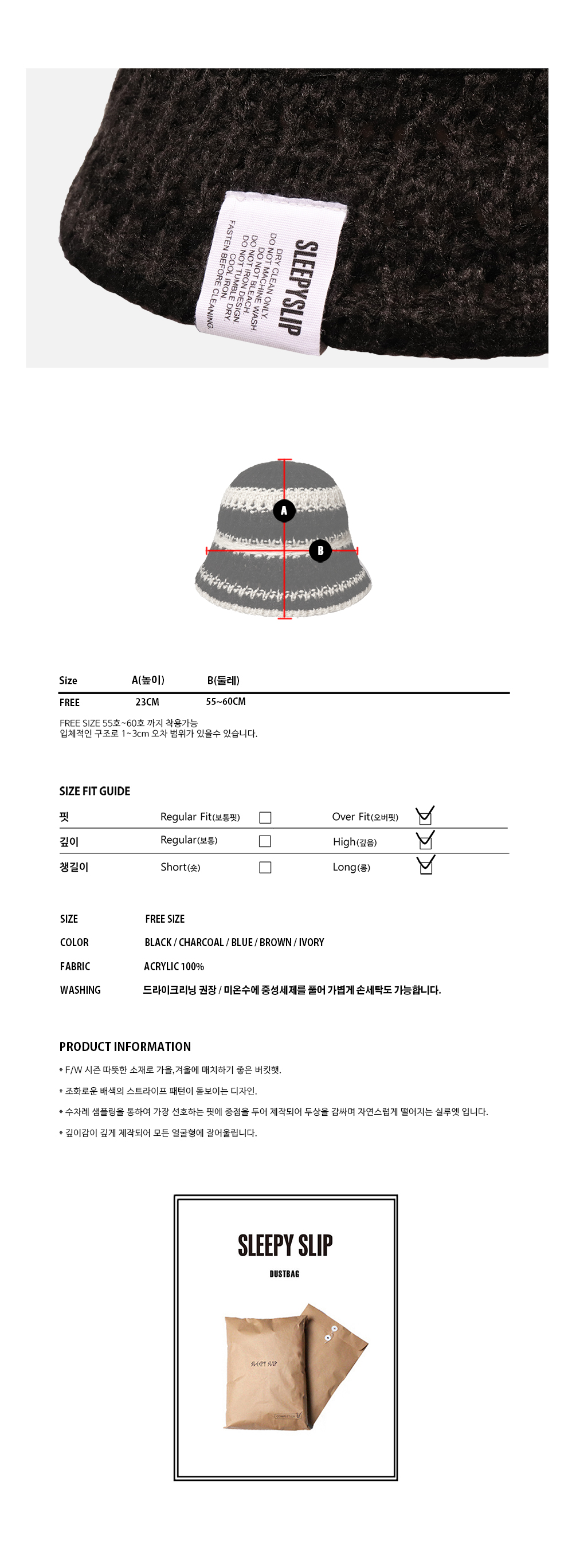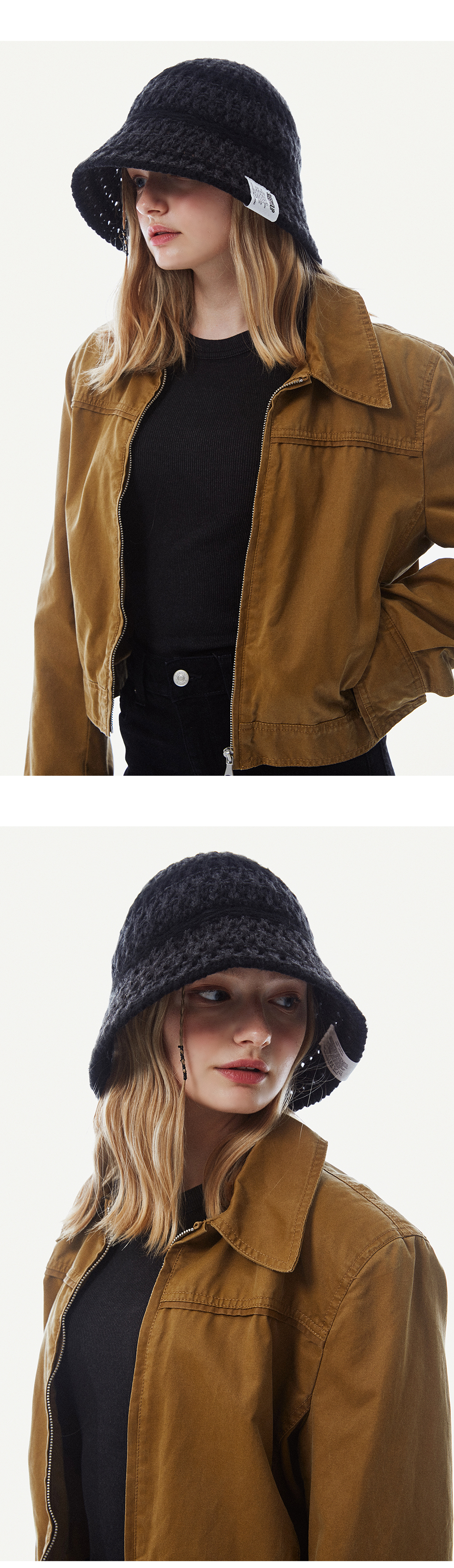 스트링 디테일로 안정감 있게 착용되는 니트 비치 버킷햇