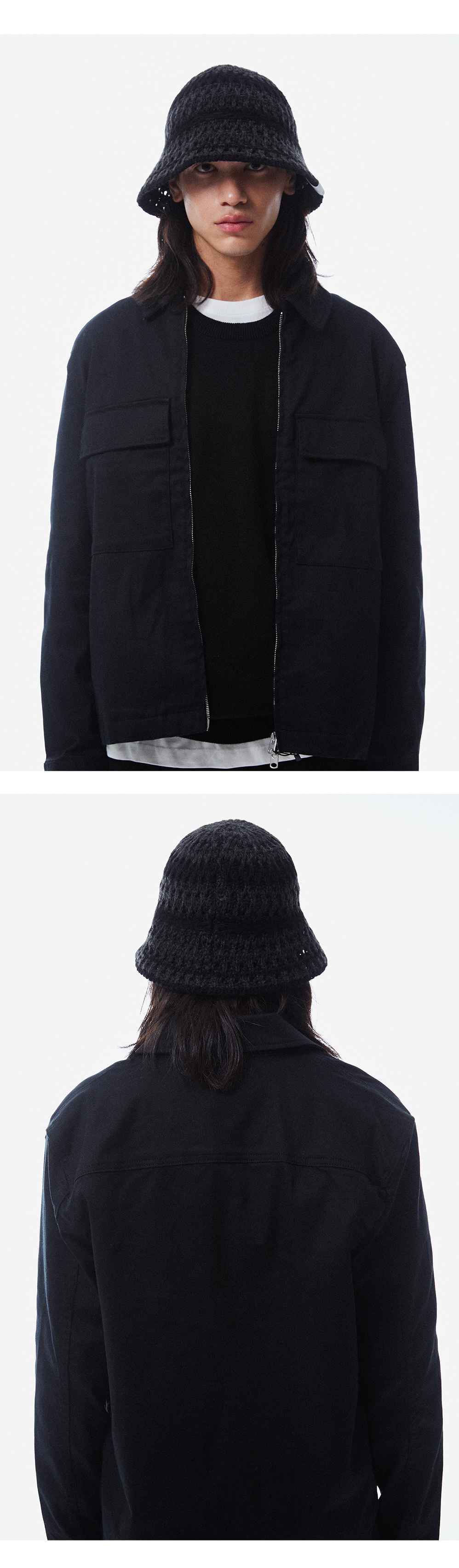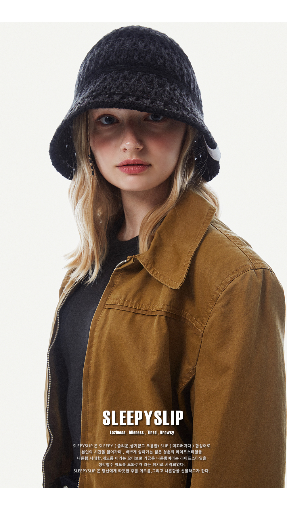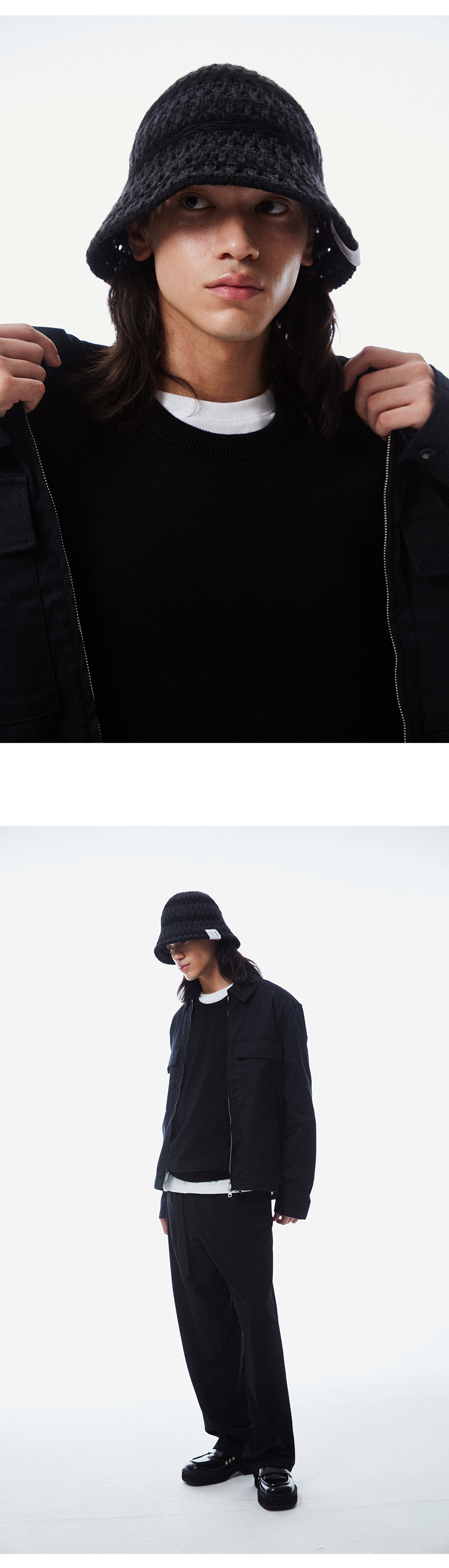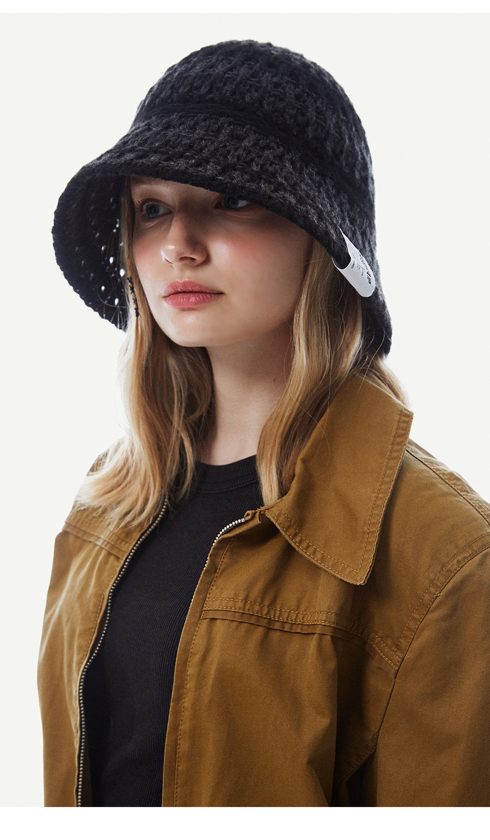 스트링 디테일로 안정감 있게 착용되는 니트 비치 버킷햇