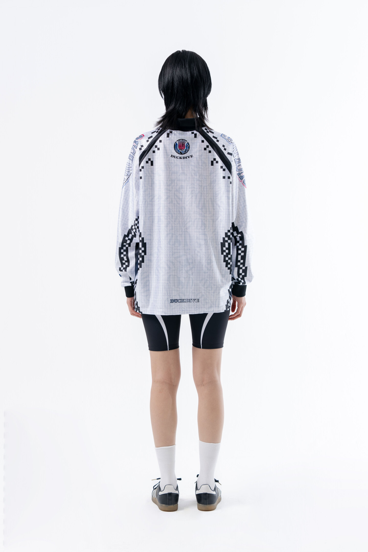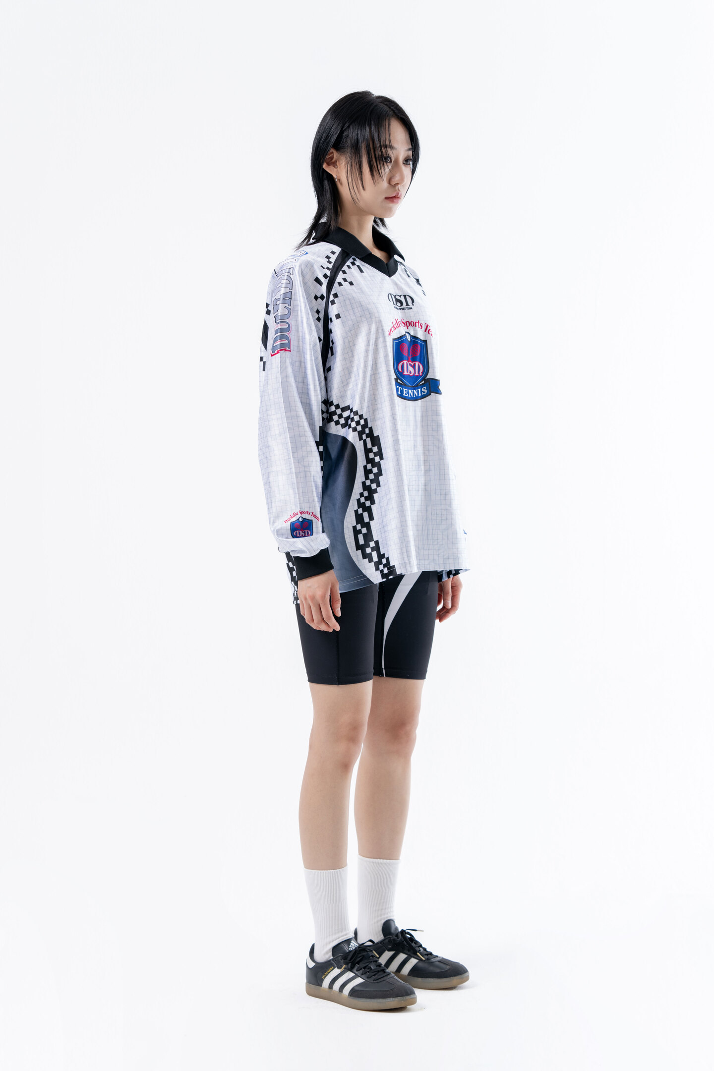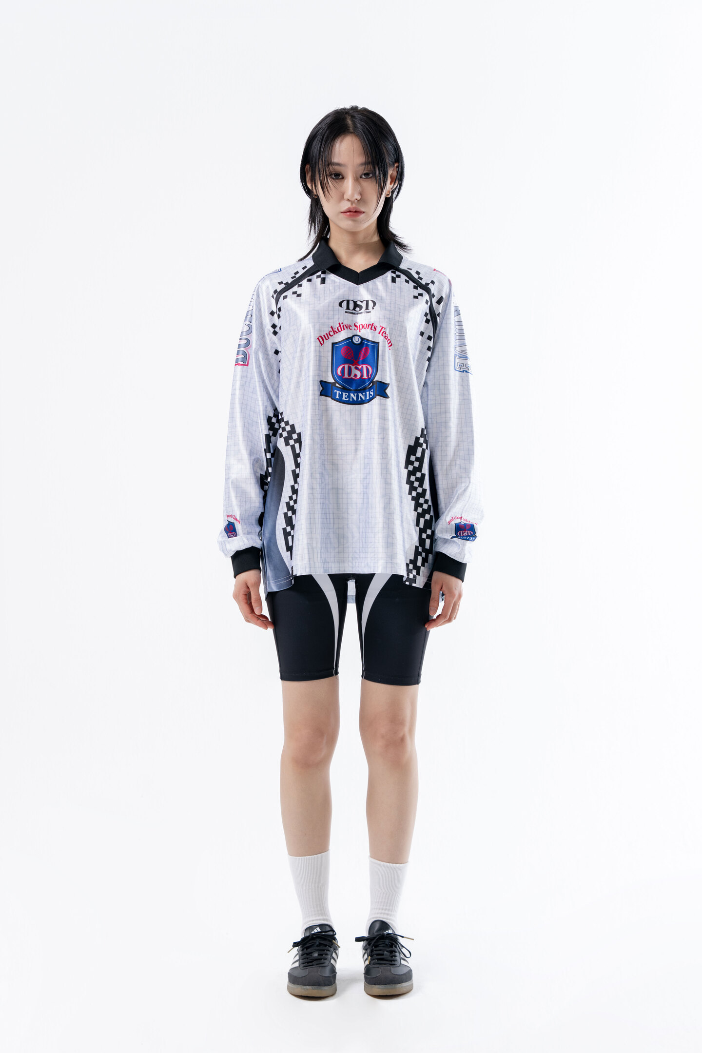 -은은한 체커 그래픽과 스포티 무드 심볼 포인트 카라 브이넥 롱슬리브